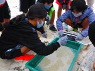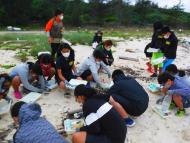 多良間小6年生の総合の授業で調査をしました。 電球が1つ生活雑貨に入っています。 強い風が続き、軽いごみは植生帯までとばされていました。 |